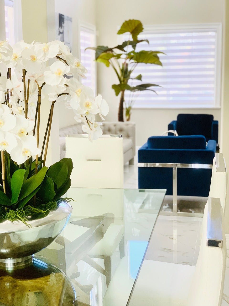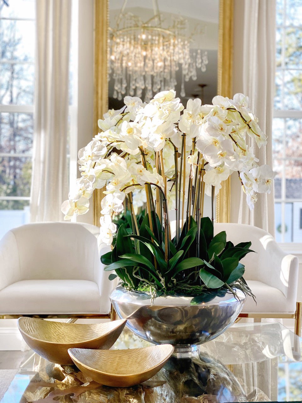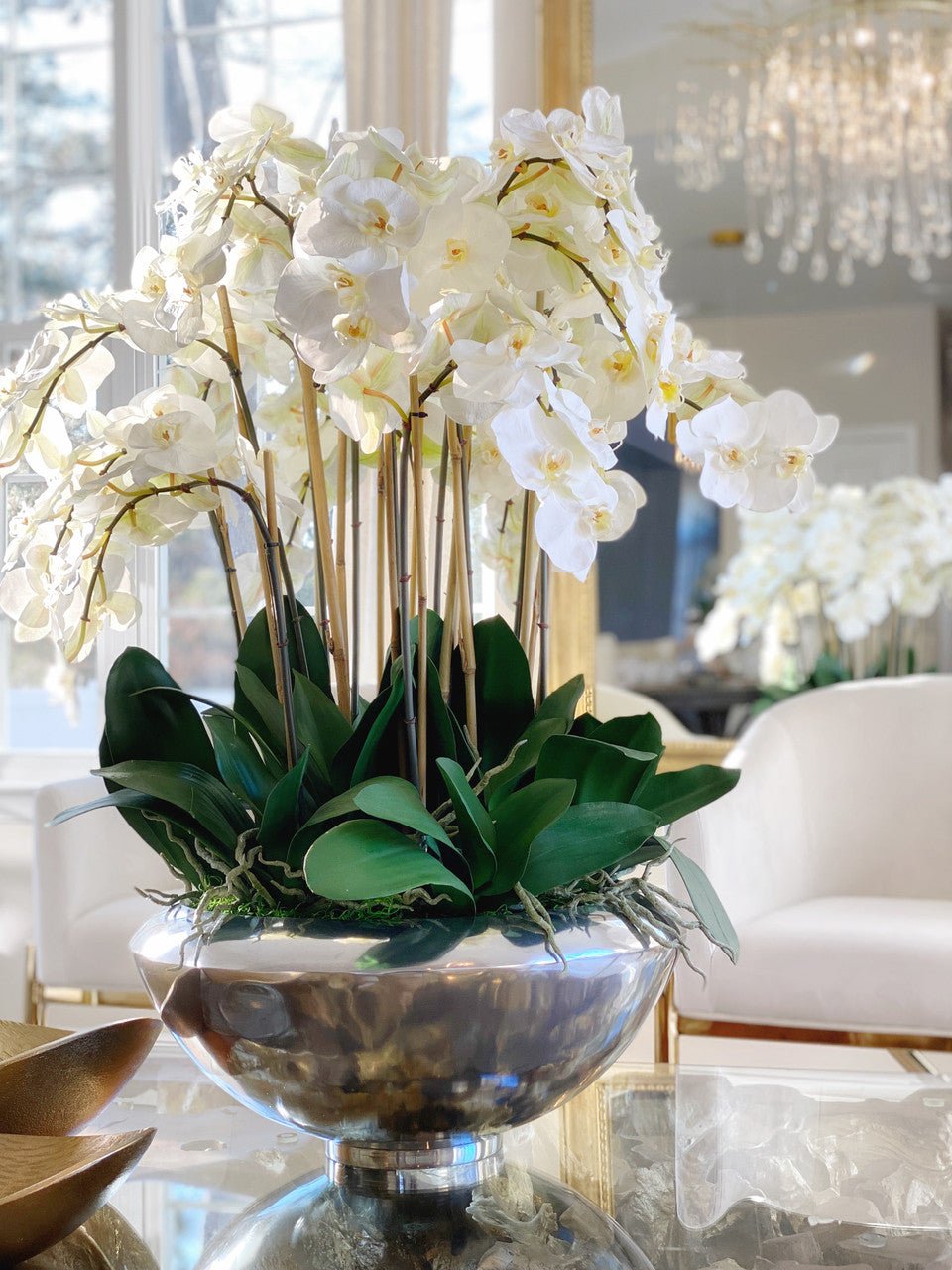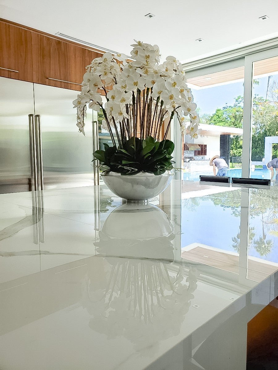 Graceful and exotic. the white orchid has symbolized integrity. nobility. and luxury for centuries. Our enduring. snow white phalaenopsis arrangement captures the artistry and spirit of natural orchids. It’s prized for its profusion of perfect blooms. Vertical bamboo stakes. broad green leaves. and a genuine moss base add to the realism of this arrangement.Often called the moth orchid. the phalaenopsis is a favorite among our designers for its dense leaves. elegantly arching sprays and lovely white blooms. Our remarkably lifelike arrangement is staked into a moss-covered silver avenue bowl for a timeless. authentic look that will endure for years to come. This arrangement is just the right size and is versatile enough to use as a coffee table centerpiece. a dining room or console table. It has a luscious tropical feel that will add vibrancy and elegance to any room.