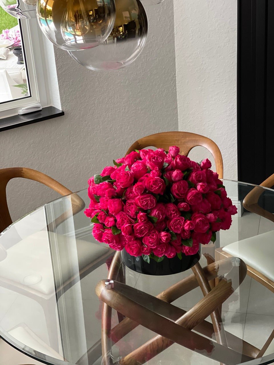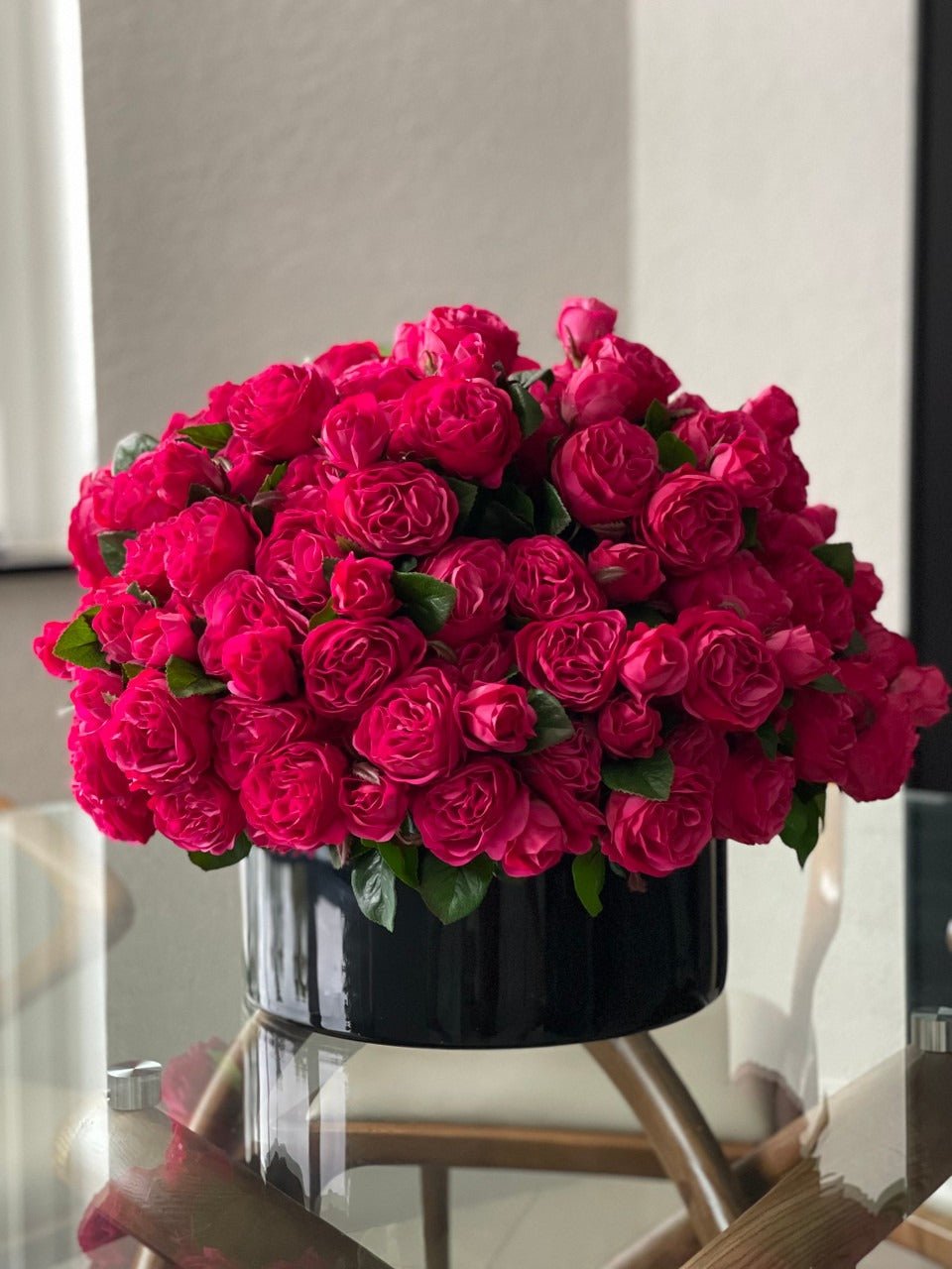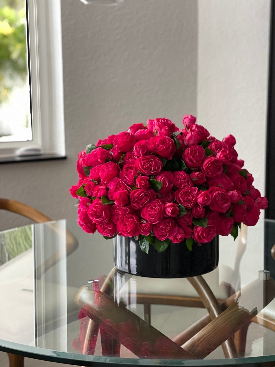 An exquisite exhibition unfolds as a cluster of deep pink English roses burst into bloom. Adorned with fully blossomed. partially bloomed. and delicately unfurling rose buds. they are artfully arranged within a sleek black glass vase. adding a timeless touch of organic allure. This unstructured composition. with its vibrant dark pink hue harmoniously contrasting against the obsidian vessel. evokes an atmosphere of refined grace and fervent ardor.
