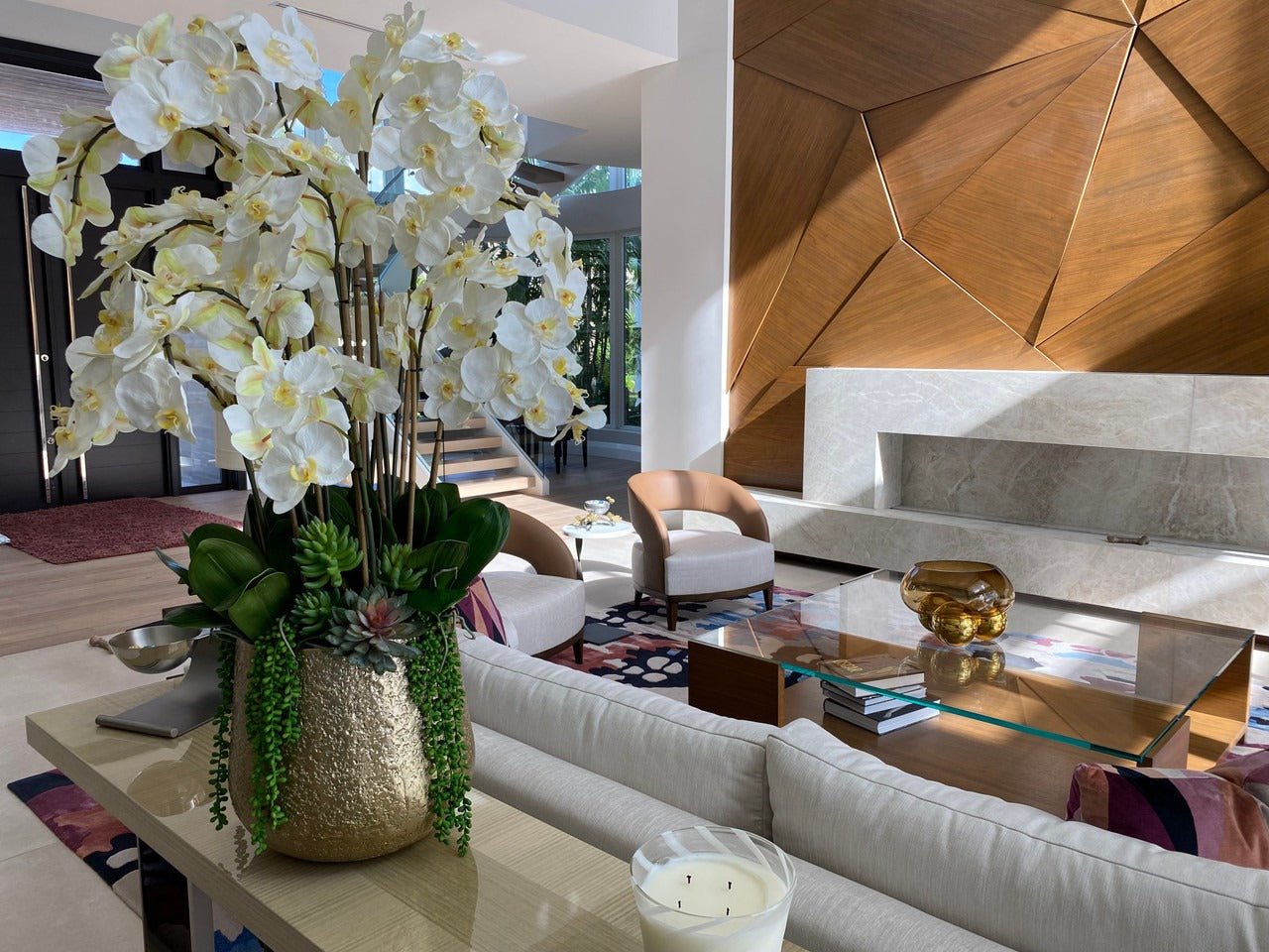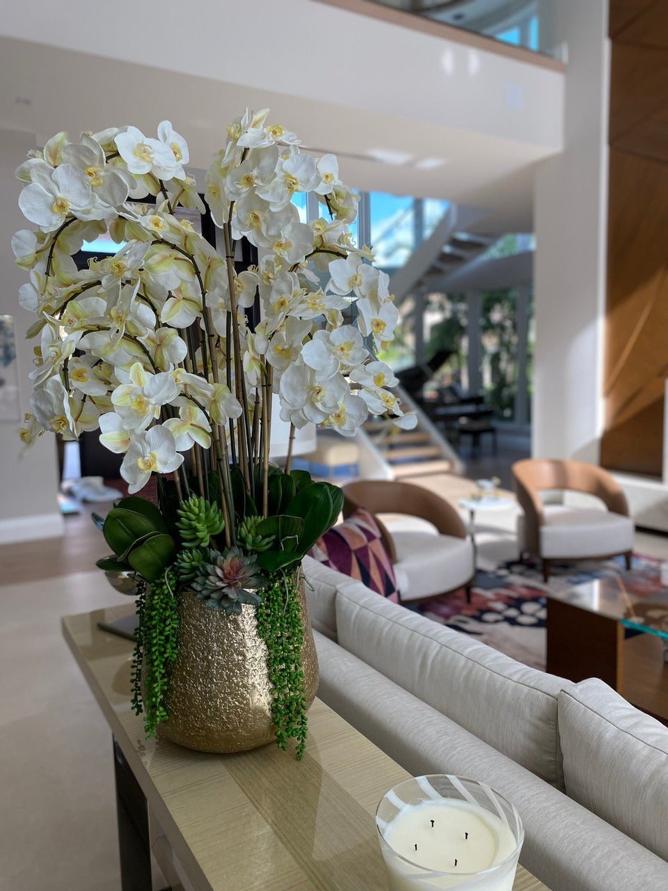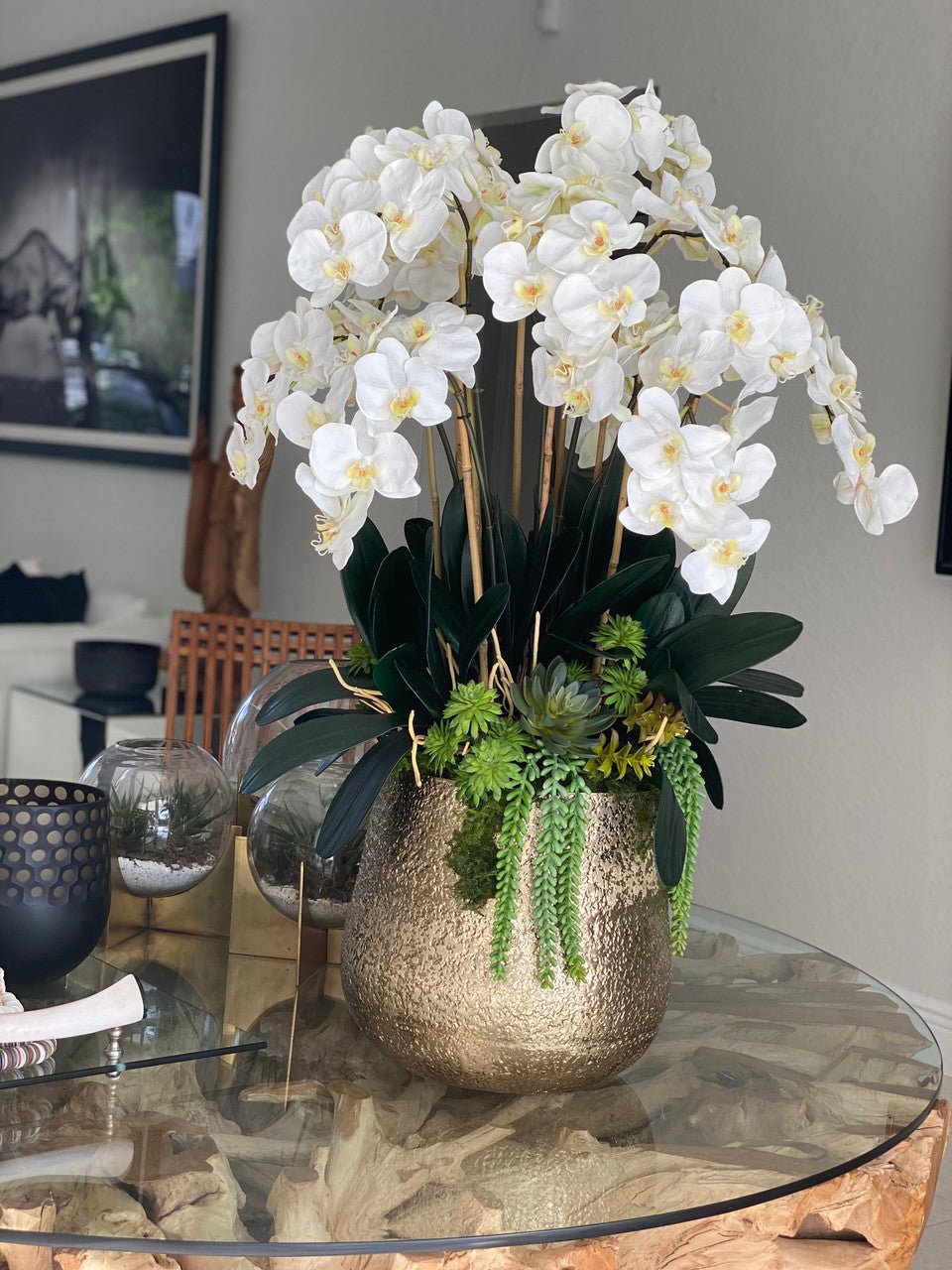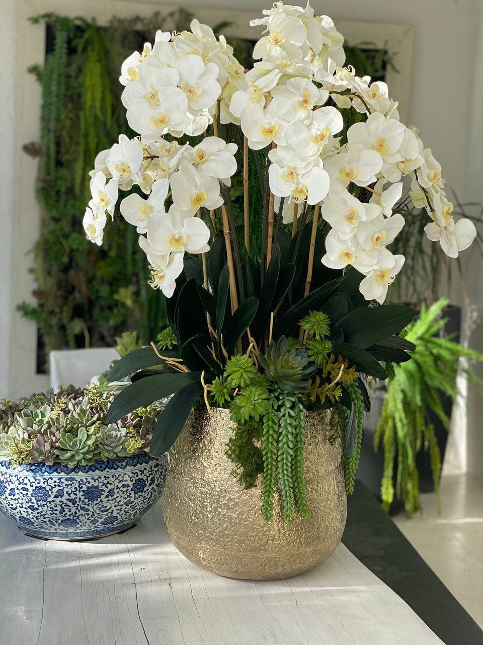 Be the first to review “Delaney Gold Pot with Multiple Stems of Phalaenopsis Orchids and Succulents”