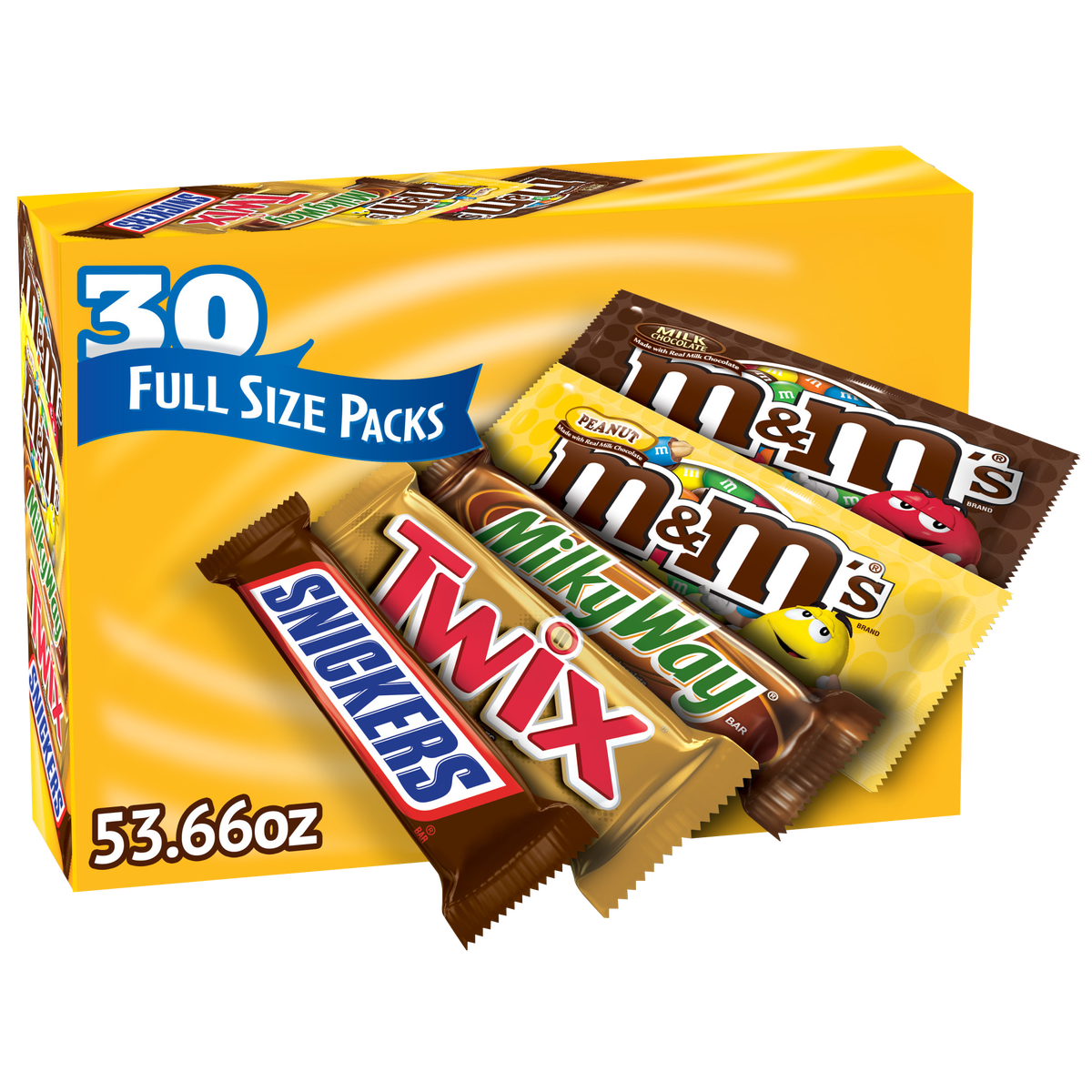 Mars 30ct Full Size Candy Variety Pack. 53.66 Ounce. 8 x Snickers Bars. 7 x Twix Bars. 6 x M&M’S Peanut. 5 x M&M’S Milk Chocolate. 4 x Milky Way Bars